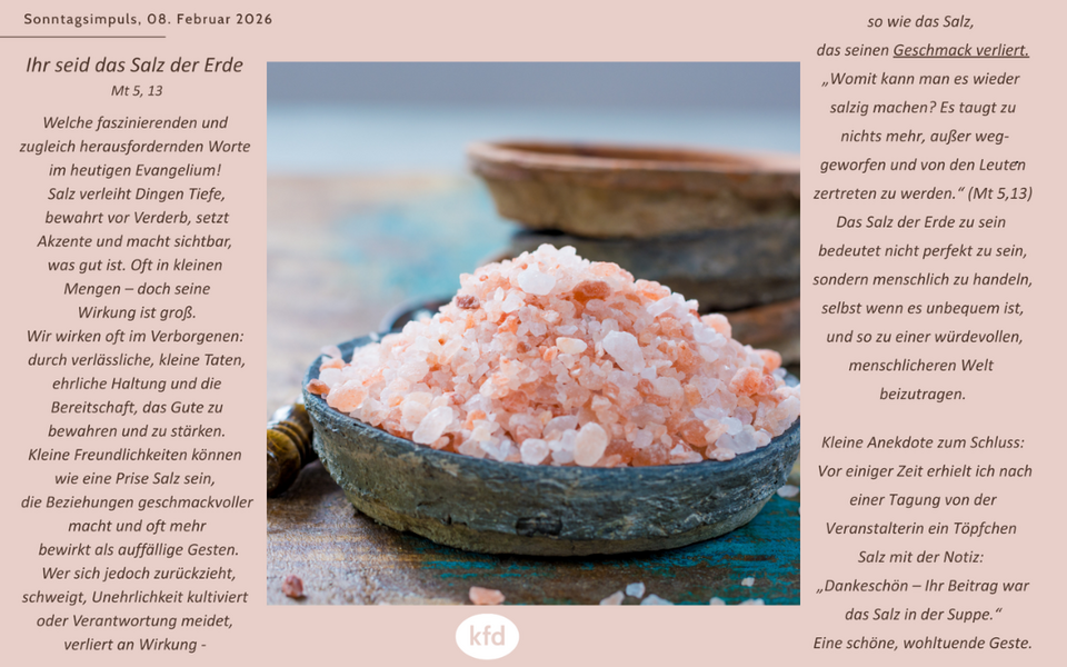 Welche faszinierenden und zugleich herausfordernden Worte im heutigen Evangelium! Salz verleiht Dingen Tiefe, bewahrt vor Verderb, setzt Akzente und macht sichtbar, was gut ist. Oft in kleinen Mengen – doch seine Wirkung ist groß.